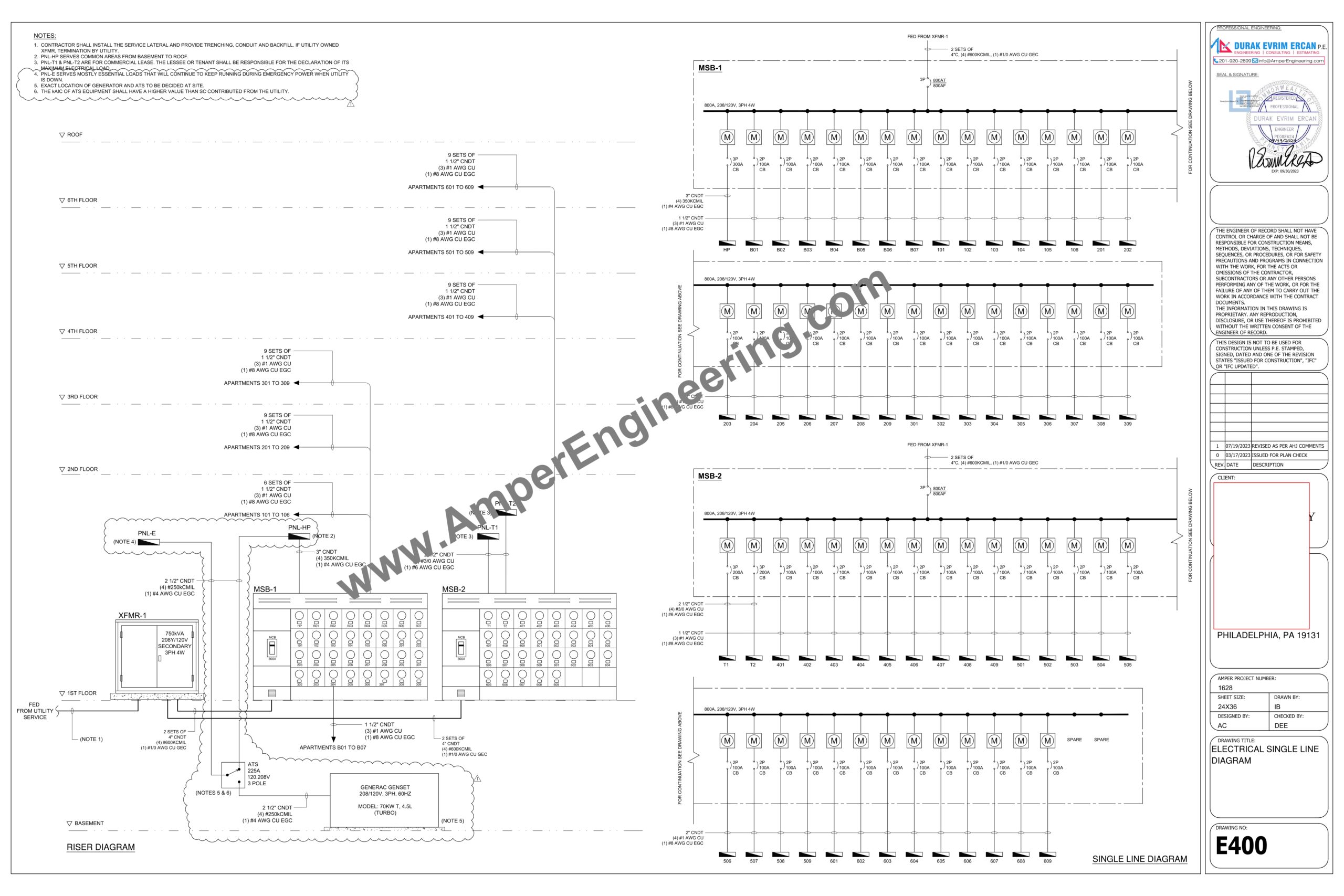 The project is a renovation type. Interior and exterior alterations of existing six-story structure to be converted from commecial/warehouse to residential space. AmperEngineering make good the electrical design that is correctly dimensioned complying NEC requirements, for the execution of an electrical installation. The electrical design offers a number of benefits, ranging from energy savings to safety. And not least, the peace of mind of knowing you can plug in a piece of equipment without the danger of flashing power or even tripping a circuit breaker. AmperEngineering will PE signed & sealed and issued for approval to obtain local AHJ permit.