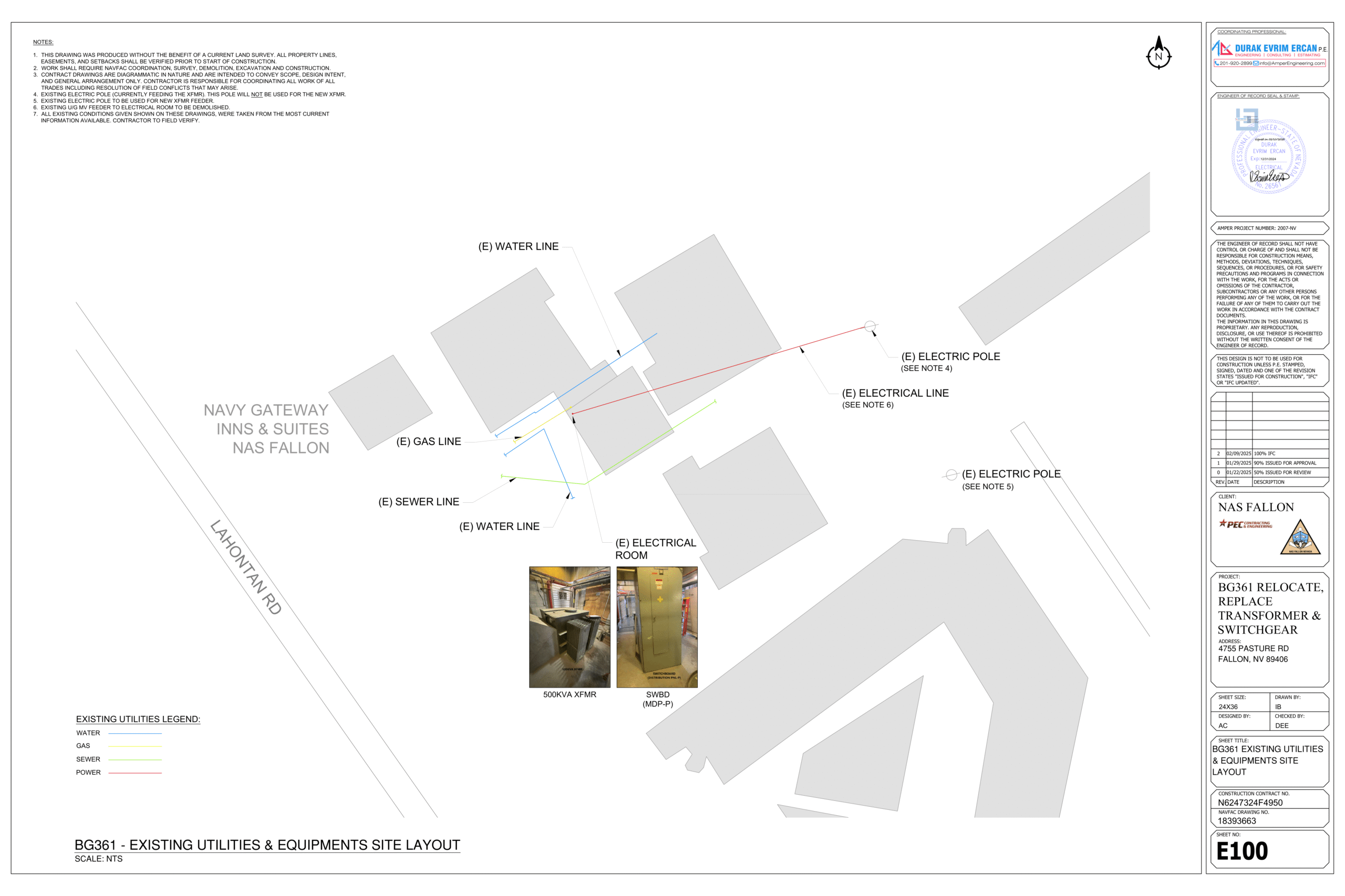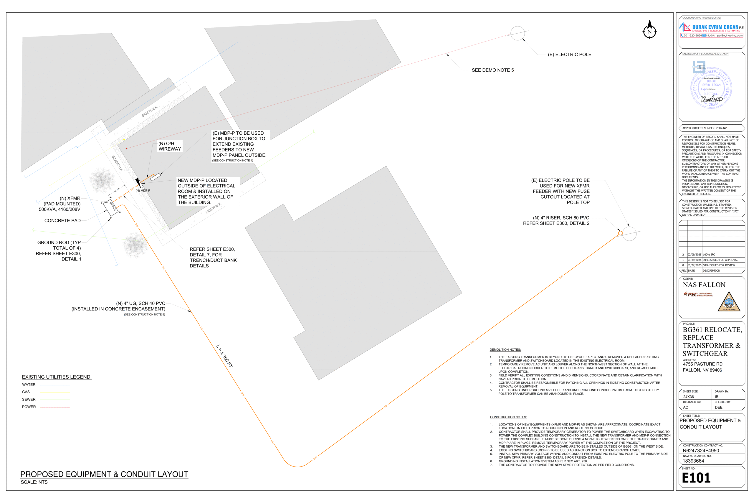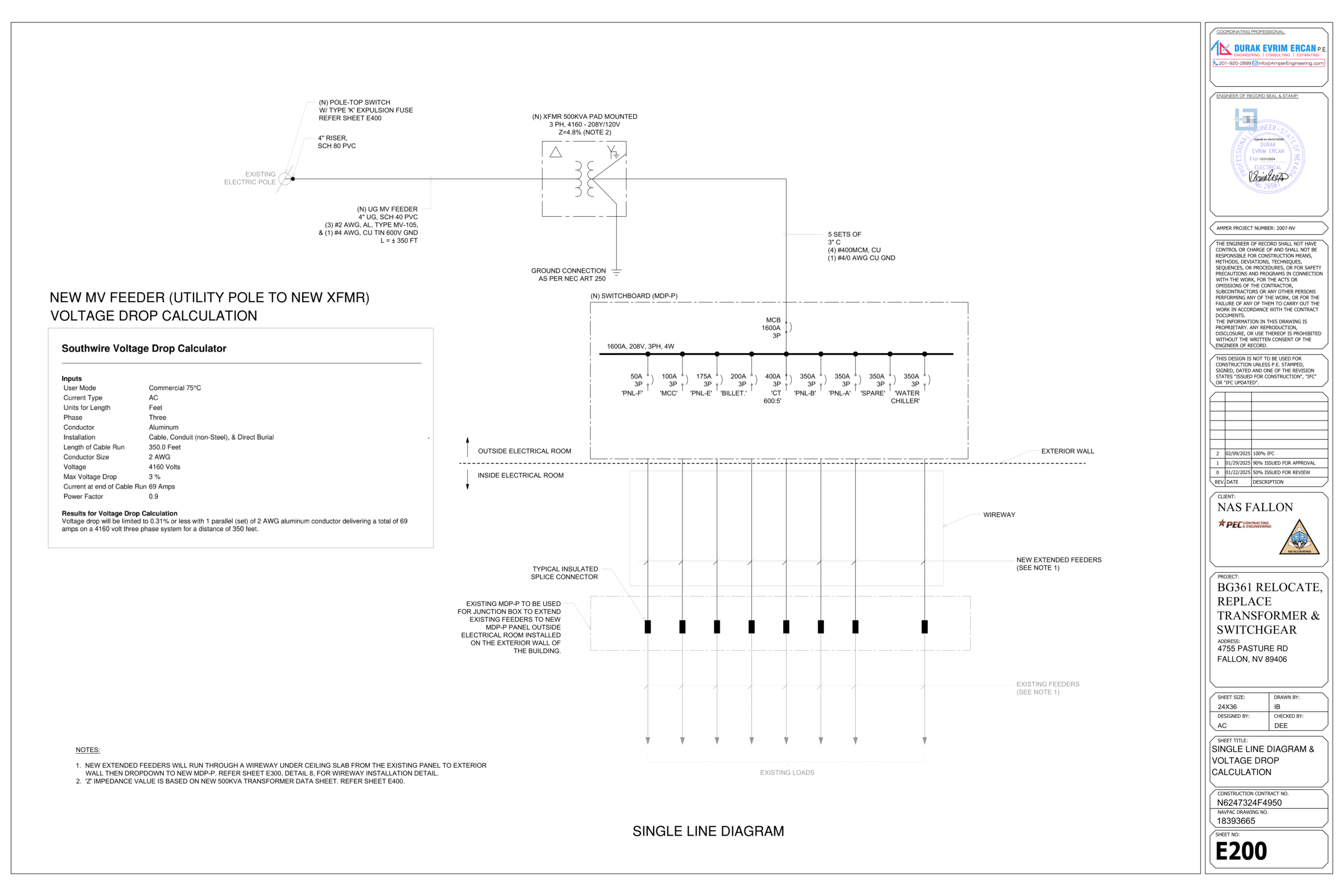 The project is for Military facility. AmperEngineering to provide electrical engineering design drawing for the installation of new transformer & main distribution panel on one of their facility with the current editions of the following as adopted by USACE, OSHA, UFC, IBC & NEC 2017. The design is to install new stepdown 500KVA XFMR (4160-208Y/120V) fed from existing electric pole with new UG MV feeder and pole top switch. Then the old MDP (located inside electrical room) now using as junction box, will extend its existing feeders to the new MDP (located outside electrical room) fed from new xfmr. After completing the engineering design, AmperEngineering will PE signed & sealed and issued for the approval of NAVFAC.